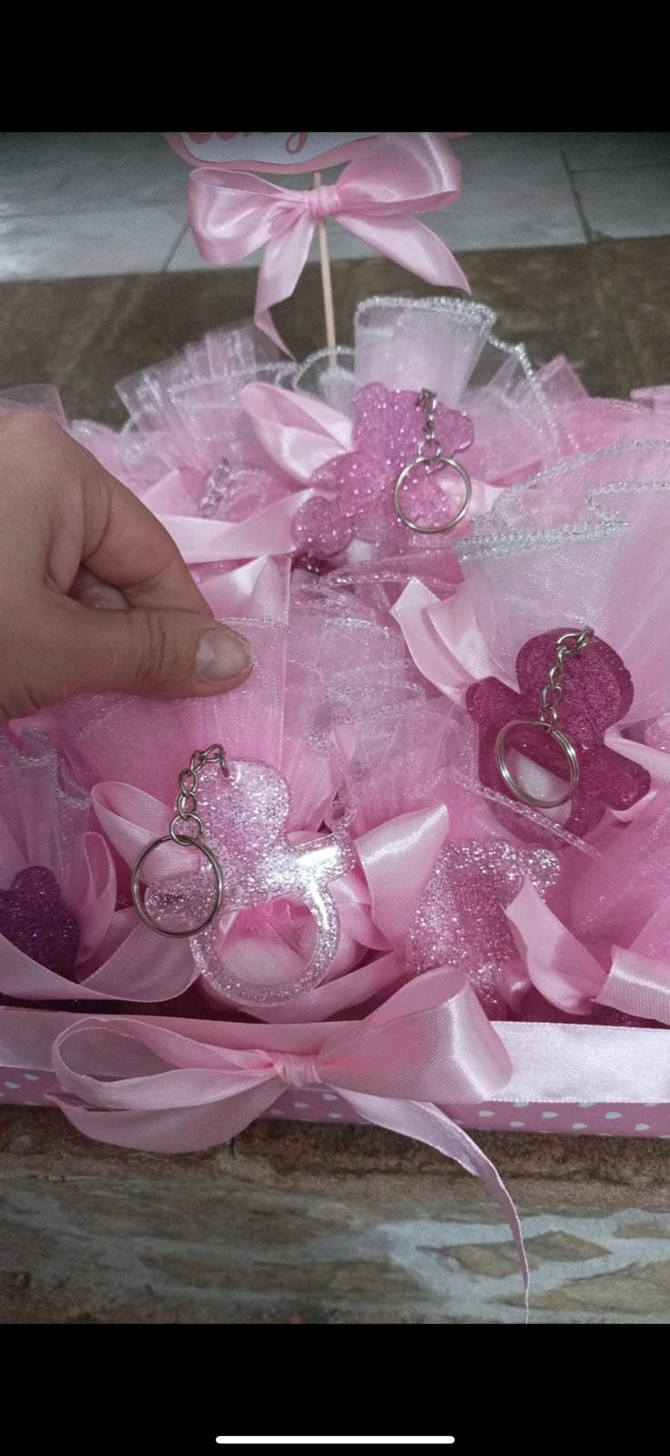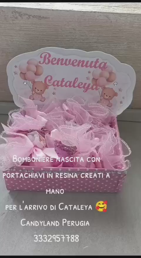 Bomboniera completa e confezionata con portachiavi in resina, possibilità di scegliere il colore e il soggetto