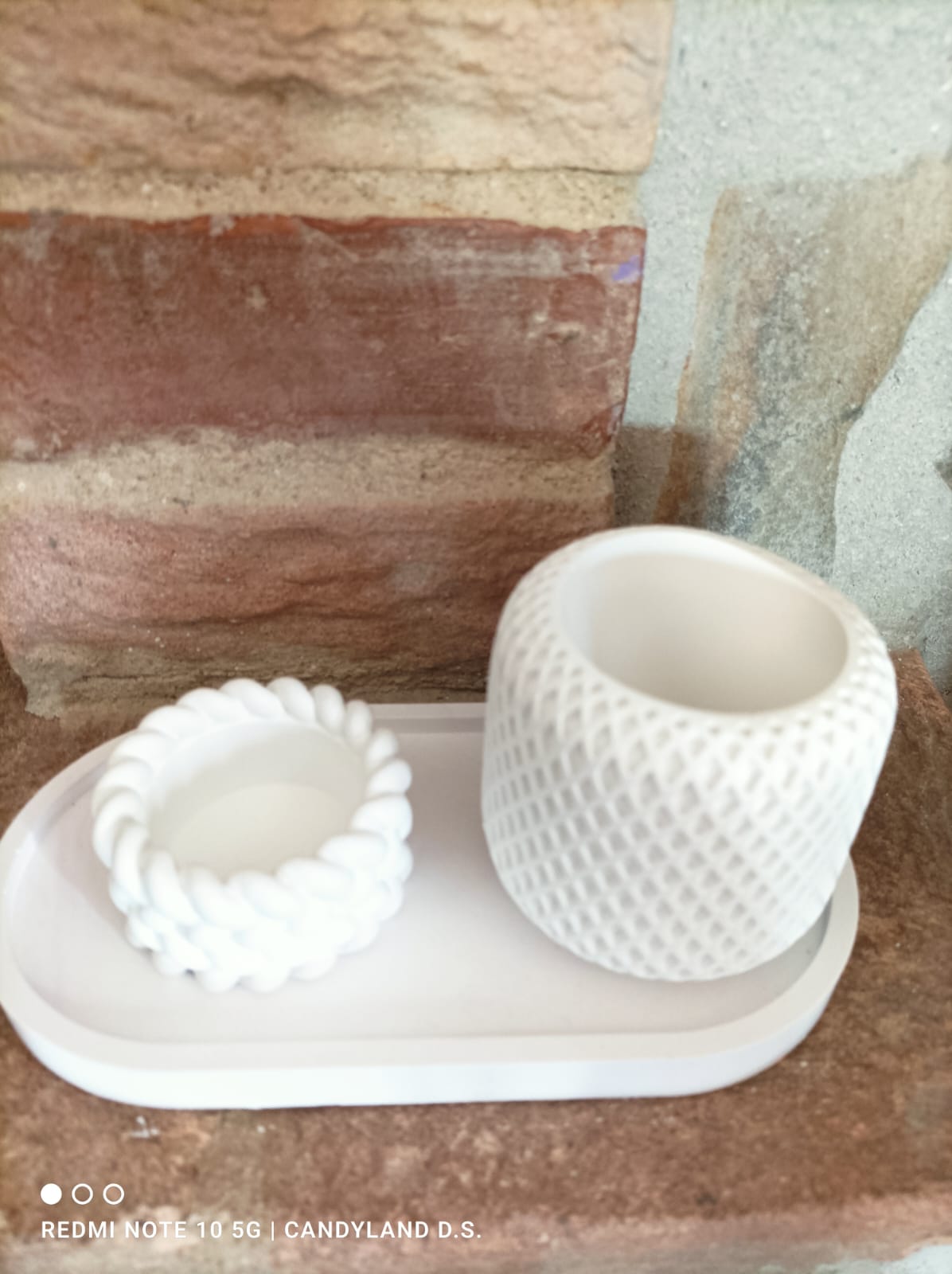 Set in polvere di ceramica composta da vassoio, contenitore piccolo, e vasetto con trama particolare che richiama un tessuto morbido, possibilità di scegliere , dettagli e colori a vostra scelta Confezione inclusa